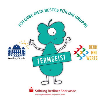Ein fröhliches türkisfarbenes Alien mit wolkigem Kopf begrüßt neuerdings die Besucher*innen der Wedding-Grundschule. Es steht für den Wert Teamgeist. Begleitet vom Verein DENK - MAL - WERTE e.V. hatte sich die Schule 2020 auf dem Weg gemacht, in einem demokratischen Prozess gemeinsam zu entscheiden, welcher Wert für die Wedding-Grundschule besonders wichtig ist. Die Wahl fiel auf den „Teamgeist“.