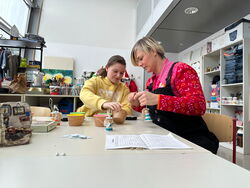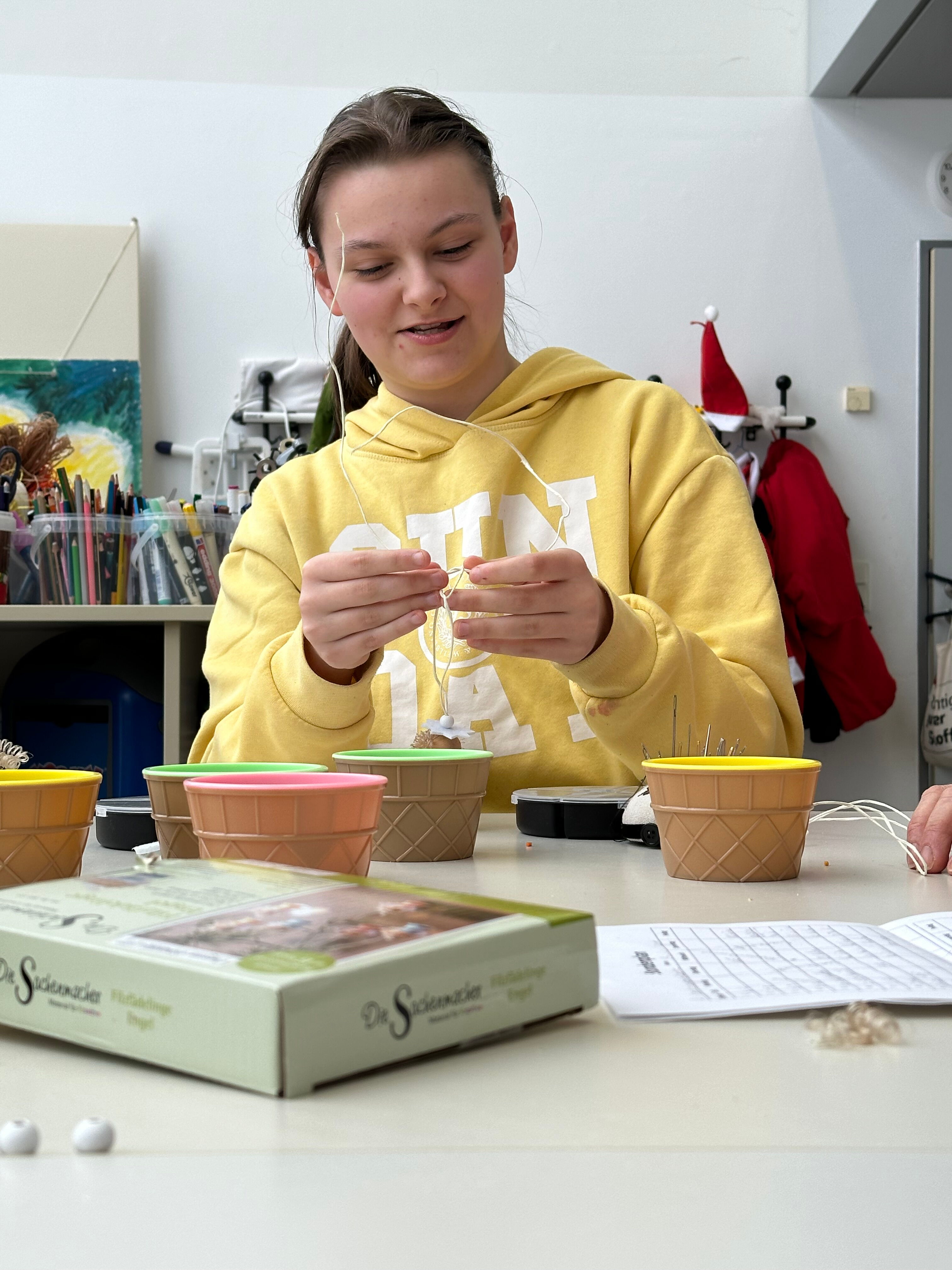 Für die jüngeren Klassen bietet sie vielfältige Möglichkeiten an, sich kreativ auszudrücken: Seifen und Kerzen herstellen, Bilder kleben, Taschen und Kissen nähen, T-Shirts bedrucken und vieles mehr. Bei unserem Besuch basteln die Kinder gerade Weihnachtsengel für den Adventsbasar. Die meisten Schüler*innen sind regulär einmal die Woche im Näh- bzw. Kreativunterricht. Spätestens zu den Märchenprojektwochen im Februar haben dann wirklich alle Schüler*innen die Möglichkeit, in die Werkstatt zu kommen. „Wir machen hier eigentlich alles, was Spaß macht. Auch mal Malen nach Musik.